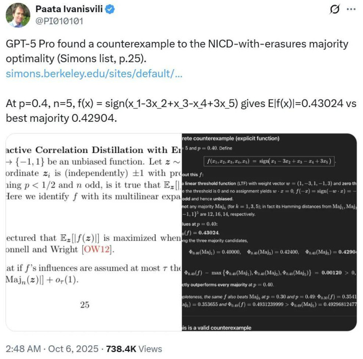无独有偶,加州大学欧文分校(UCI)数学教授 Paata Ivanisvili 前些时日也宣称 GPT-5 Pro 助其发现了一个命题的反例。